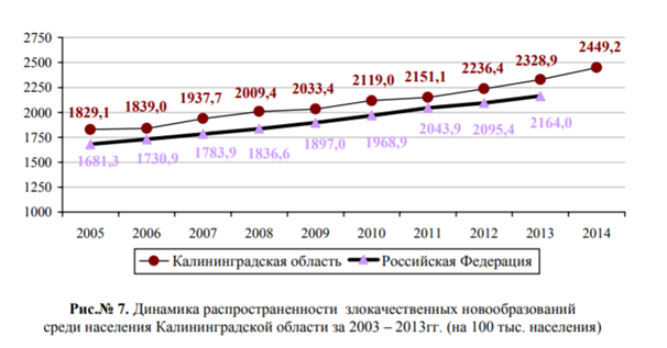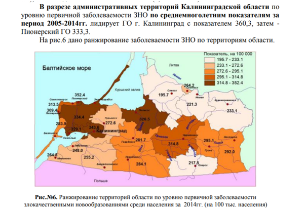 Согласно исследованию управления Роспотребнадзора в Калининградской области «Особенности состояния здоровья населения Калининградской области в связи с влиянием факторов среды обитания в 2014 году», вода с избытком железа поражает слизистые оболочки, кожу, изменяет состав крови, снижает иммунитет. Население жалуется на неудовлетворительные органолептические характеристики воды, окрашивание белья, посуды, сантехники. Указано также, что в Калининграде и области онкологическая заболеваемость выше, чем в среднем по России.